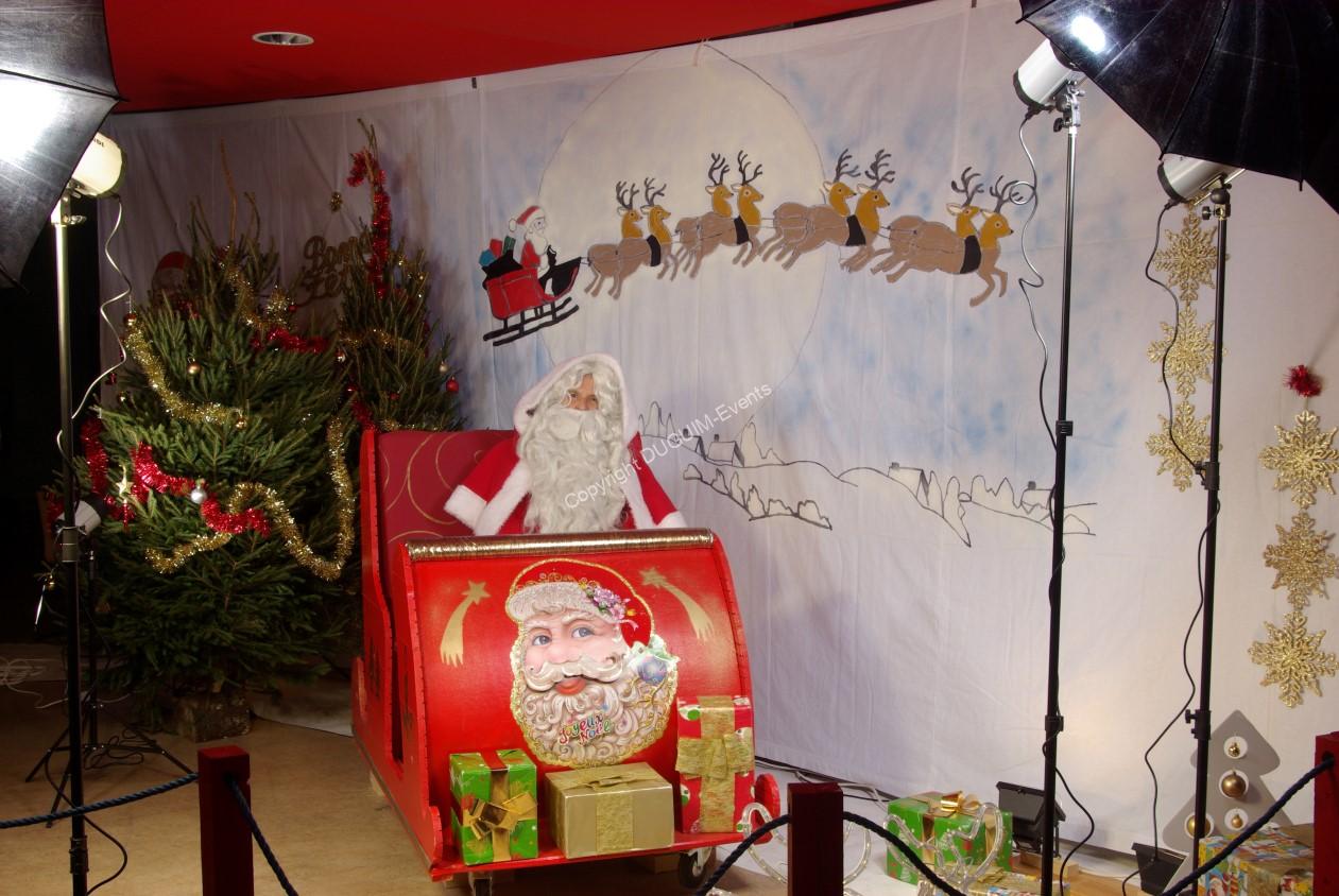 Création, mise en place et démontage du décors avec Fourniture de Sapins, Traineau, Biches, Fond de prise de vue, etc…